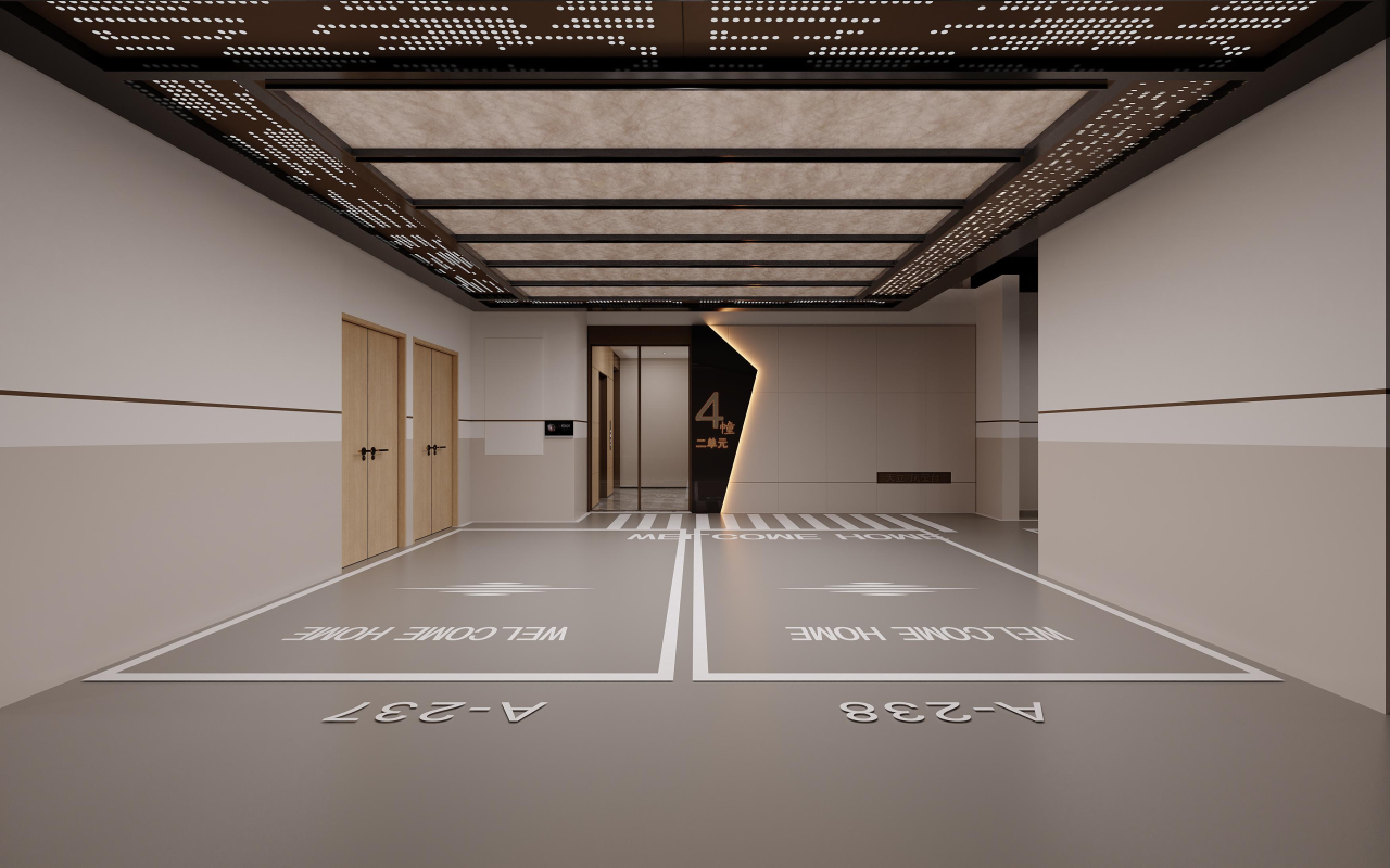 车库入口处,抬头即是璀璨“星空”,细碎光点温柔笼罩,让每一次归家都像穿越浪漫星河。金属铝板勾勒利落轮廓,搭配透光膜让空间明亮通透。电动感应门守护安全,铝板楼栋单元号清晰醒目,乳胶漆分色设计层次分明,灰色车库地坪漆延续整体质感。