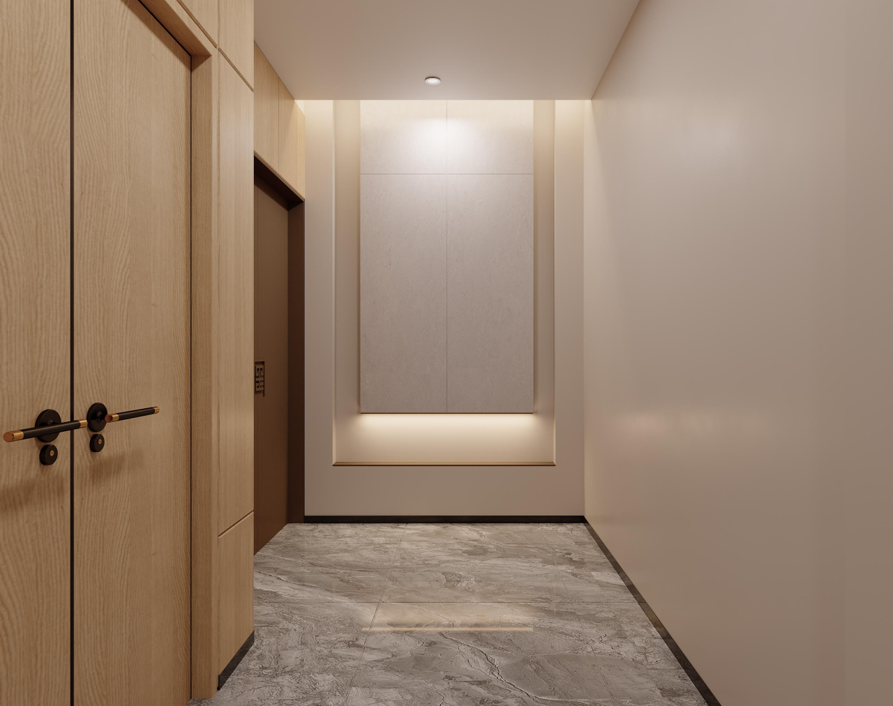 车库电梯厅,延续项目高端配置,不锈钢踢脚线、岩板暗藏灯带、深灰色仿大理石地砖,让优雅质感贯穿归家全程。