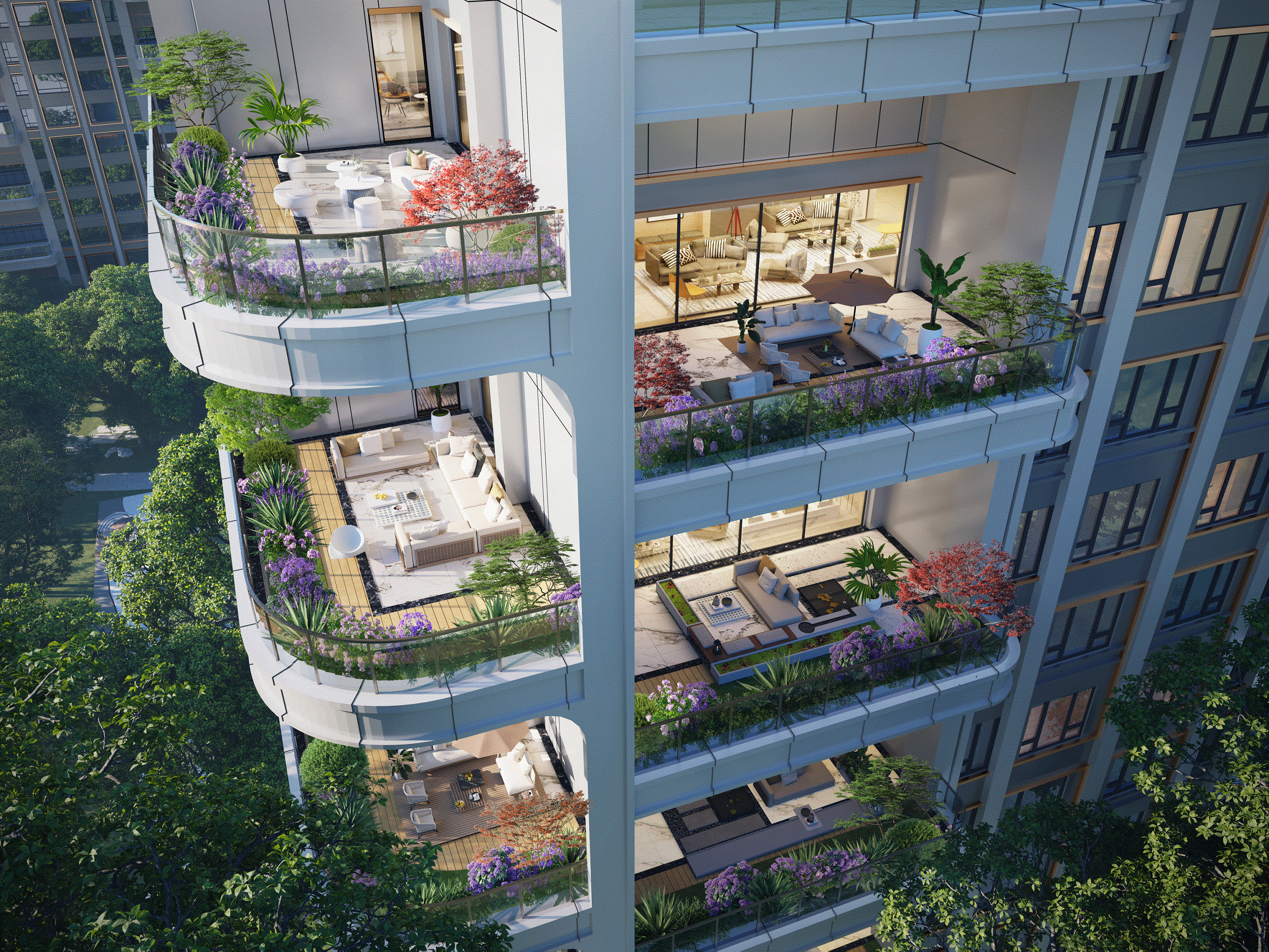 最令人心动的,莫过于每户标配的40-60㎡空中庭院——这个足以媲美一间卧室的超大空间,是云河上院献给业主的慷慨馈赠。想象一下,清晨在花香中苏醒,推开窗便是满目苍翠,长辈在庭院里侍弄花草、品茶下棋,孩子在草坪上追逐蝴蝶、搭建帐篷,傍晚与爱人伴着落日余晖小酌闲谈,这样的生活场景,曾是别墅独有的特权,如今在云河上院的高楼层里就能轻松拥有。更难得的是,项目在设计之初就攻克了四代宅常见的痛点:通过“上部不开窗”的创新设计与隐形隔墙的加持,彻底保障了庭院的私密性,再也不用担心楼上邻居的视线干扰;针对大进深可能导致的暗房问题,设计师反复优化户型布局,用更大的采光面与科学的通风动线,让室内每个角落都洒满阳光,真正实现“全明通透”。