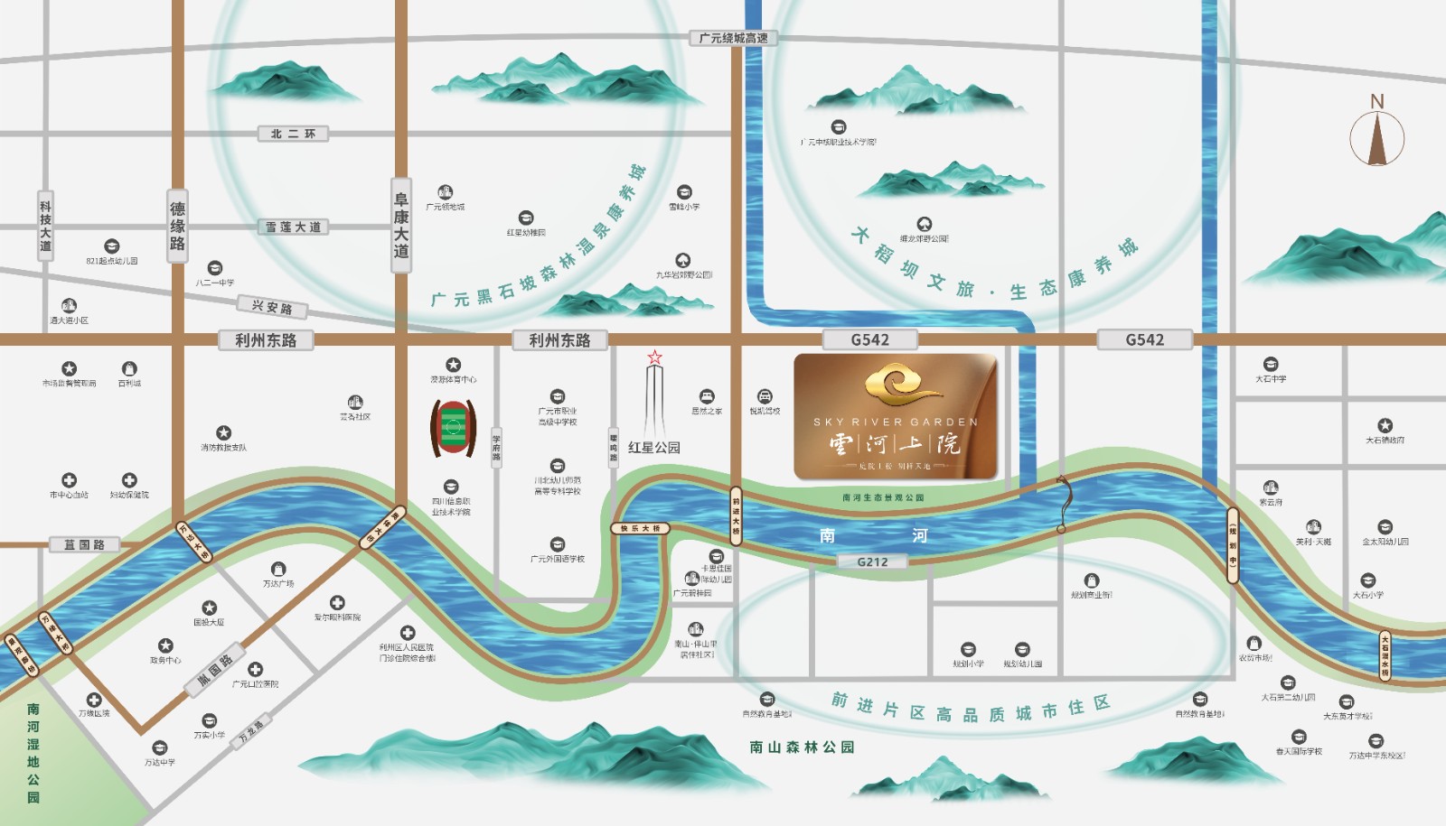 如果说第四代住宅是云河上院的产品内核,那么得天独厚的自然与区位优势,便是它无可复制的加分项。项目择址南河北岸、两河交汇之处,占据约427米一线河岸线,将广元母亲河的浩渺烟波化作窗前的日常画卷 。清晨推窗,薄雾缭绕的河面与岸边的翠绿林带相映成趣,呼吸着富含负氧离子的清新空气,仿佛置身天然氧吧;傍晚漫步河岸,落日将河水染成金红,微风拂过带来阵阵草木清香,所有的疲惫都在这一刻烟消云散。