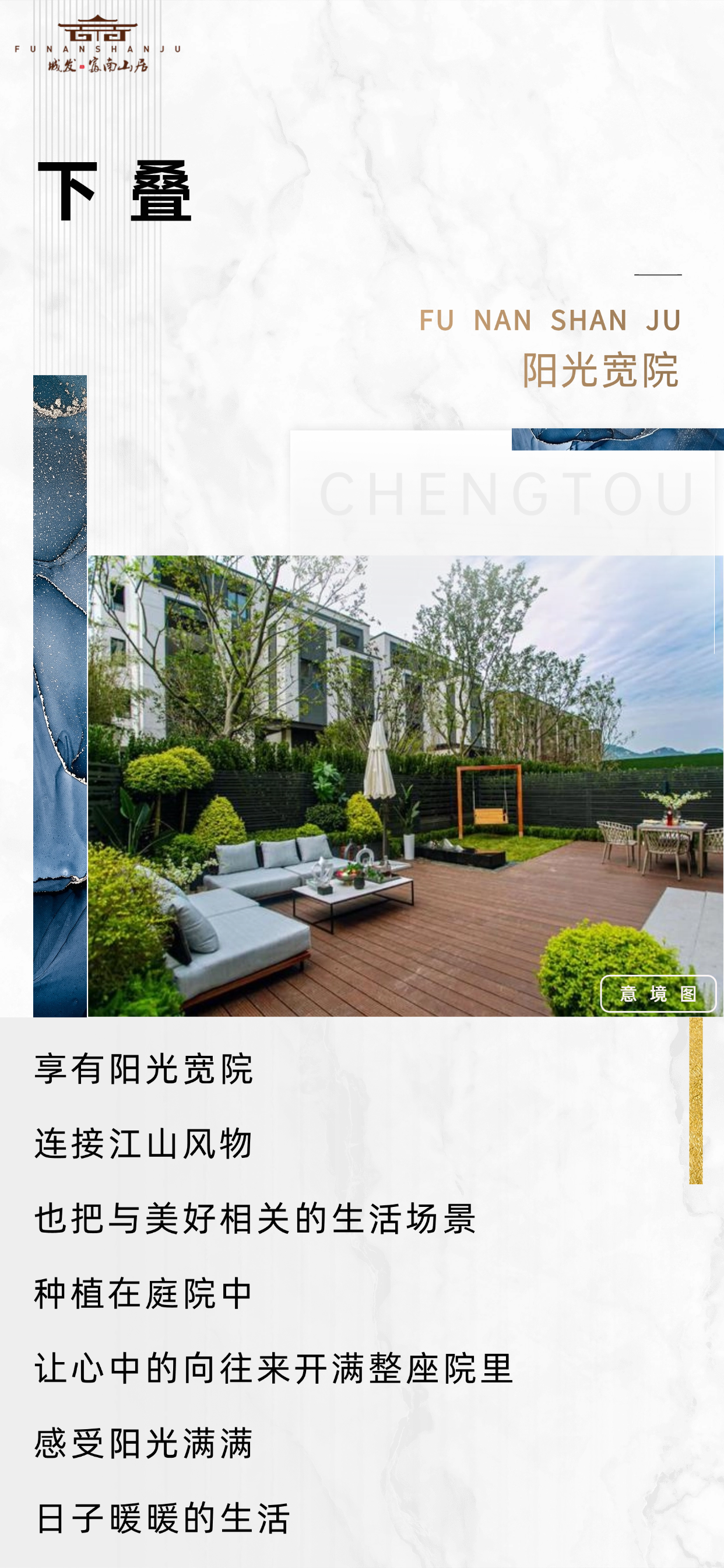 ·山居叠院 圈层共识· 让生活匹配灵魂 在圈层中修为品质人生 时代级产品,不止定义一个市场 更在于定义一类人群 建筑可以复制,圈子却难以模仿 △图片源于网络 居住的价值 隐藏于其中最*的 是其与城市之间的关系 只有那些既能享受*自然资源 又能俯瞰城市繁华背景的区域 才是*有价值的居所 △项目区位示意图 随着土地资源的紧缺,每座城市只有一座塔尖作品,城芯产品只定制不复制。作为城芯现象级产品,富南山居以自我超越的焕新高度,择址万缘*地段,以170余亩恢弘手笔,匠造低密度大盘,与土地共鸣臻意。 △项目效果图 大隐于市,是东方哲思的至高境界。富南山居外揽城芯万象,内藏奢享谧境。浓荫掩映的台地园林,将喧嚣悄然隔绝;院墙之内,流水潺潺、竹影婆娑,自成一方隐贵天地。居于此,既可执掌城市风云亦可独享身心归隐,恰似陶潜笔下“结庐在人境,而无车马喧”的诗意栖居。 △图片源于网络 在城芯的黄金经纬上,富南山居以“低密”为魂,重构高阶生活秩序。以6+1的叠院产品,为城市高阶匠著一生之宅。从厅堂至居室,皆以从容之姿容纳生活仪式让阳光与清风成为日常诗篇。低密非疏离,而是以从容的尺度,赋予城市峯层更*质的生活意境。 △图片源于网络 当城市高层住宅林立,低密墅境更显弥足珍贵。富南山居深谙城市塔尖人群的居住需求,匠呈建面约125-168㎡城芯墅境叠院,考究奢适的空间格局,颠覆传统生活想象的人居创造。更是成为高净值人群倾心的资产所选。 △项目效果图 唯*,最珍贵。拥有适配的产品,则是朋友圈层的“里子”,对于大多数人来说,选择的生活区域,也决定了自己的日常社交圈。富南山居叠墅无形之间,划定了高净值的准入门槛,每一席,解释峯层人物私藏,成就纯粹的高净值圈层聚集地。 △图片源于网络 富南山居叠院一层一天地,打破单一的空间格局,将具有相同品味、社交圈本就契合的志同道合者聚集在一起,不必驱车远行,即可和朋友在家中共品佳肴;伴着醉美风景,择此而居,以友辅仁。 星空露台 盛满月光与私语,俯瞰城市烟火 一壶清酒,或是一盏香茗 独一份闲暇时辰 品味一轮百味人生 有天有地有露台,让生活归于本真 △图片源于网络 层层舒阔空间 分层生活,独立私属领域 一层私享 一层分享 楼上楼下 合而不扰 让属于全家的惬意舒居铺陈开来 私家入户庭院 南山为寄,院落为伴 孩子的自然课堂也交给了庭院 在一方阔景中探索奇妙世界 在四季花园中读懂自然的奥秘 孩子的纯真天性是生活*的礼物 △项目效果图 繁华城市中,寻一片宁静 一种尊贵,一种生活态度 这便是富南山居赋予我们的向往 建面约125-168㎡叠院 首开8栋 珍藏限席, 揽山院墅 无数高端人群翘首以盼 以院落时光刻画理想生活