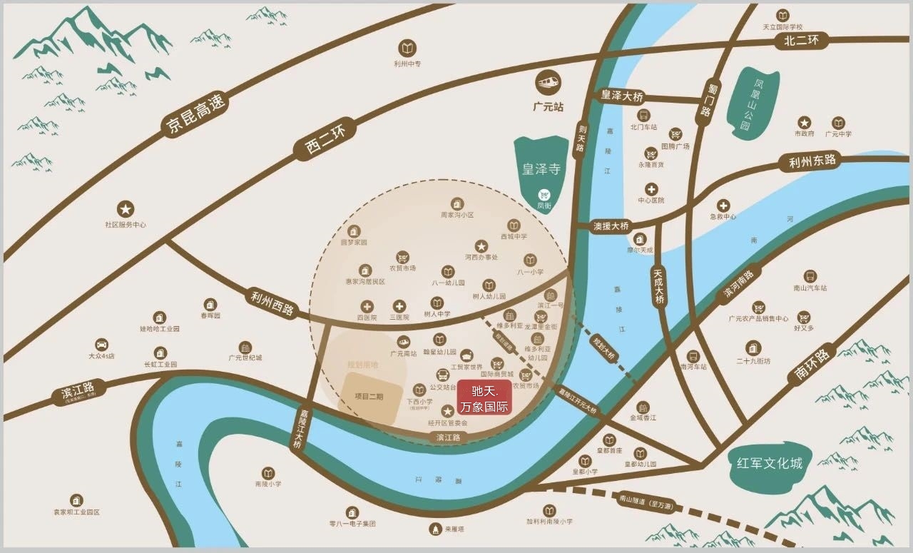 万象国际雄踞会展中心*位置,占地230余亩,100万方宏大建筑体量,规划有广元首列法派院落式商业街区、集中商业中心、欧洲风情步行街、SOHO写字楼、滨江幻变华宅等产品形态,包括大型商超、院线、精品服饰、时尚精品酒店、国际双语幼稚园等多种业态。集“商业、文化、观光旅游、餐饮娱乐休闲、高端居住、教育”等于一体,商务、居住、购物、文化娱乐一应俱全。