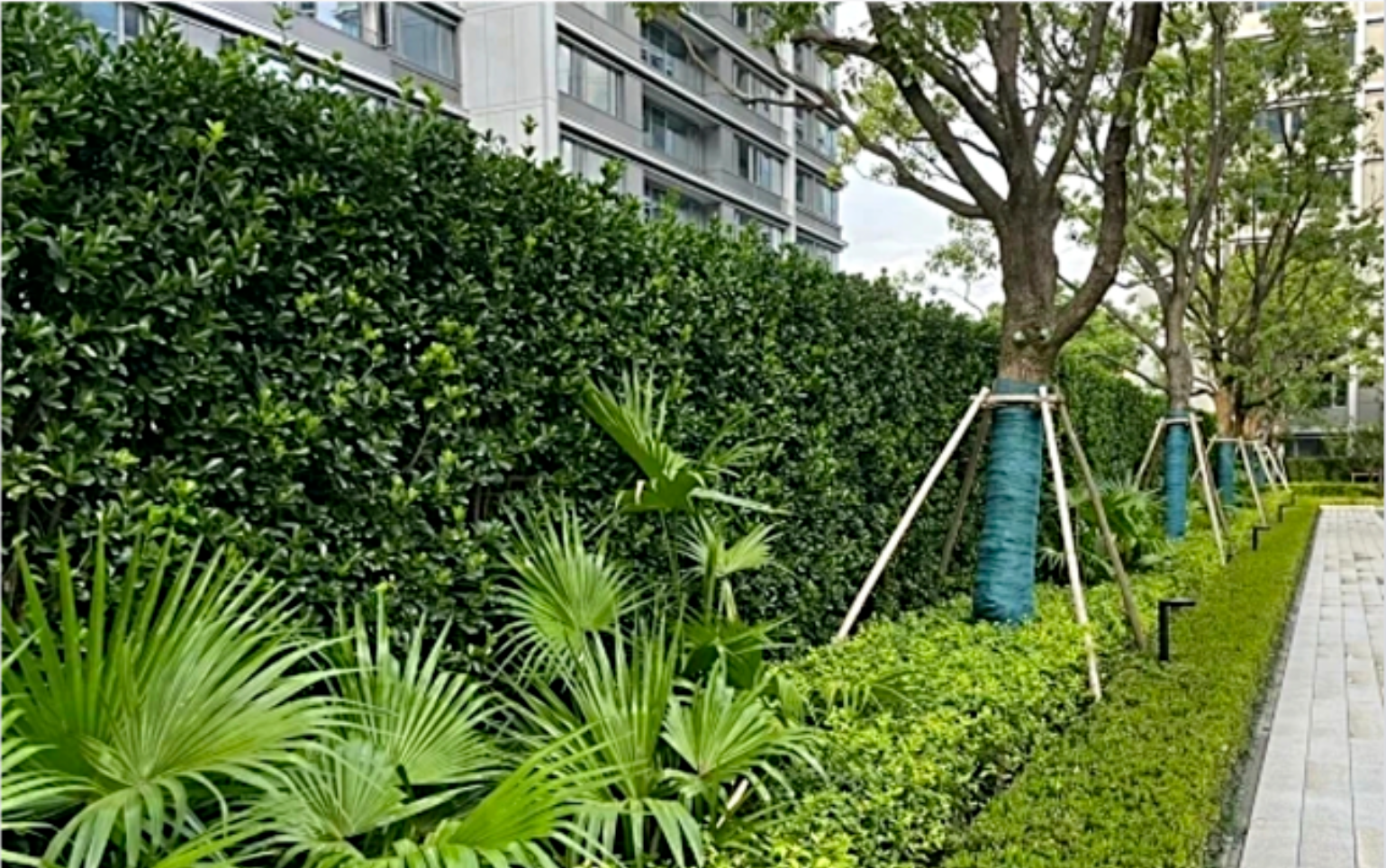 围墙绿篱·自然柔化: 在1-2#、1-4#楼围墙区域,我们增植了棕竹等绿篱植物。它们将有效弱化围墙的生硬感,让家园的边界更自然地融入绿意之中,为您营造更放松、更贴近自然的归家氛围。