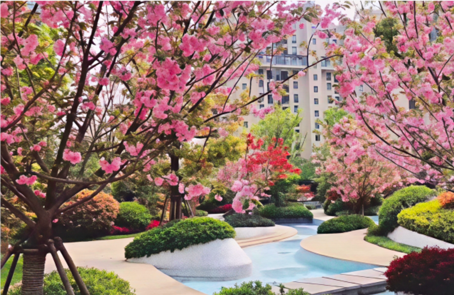 春日序曲: 沿着2、3#楼围墙,一条樱花大道正悄然成型。待到早春时节,粉色的樱花将如云似霞般绽放,形成壮观的花海长廊。让您足不出户,便能沉浸于烂漫春光之中,随手一拍即是打卡大片,记录下与春天的美好约会。